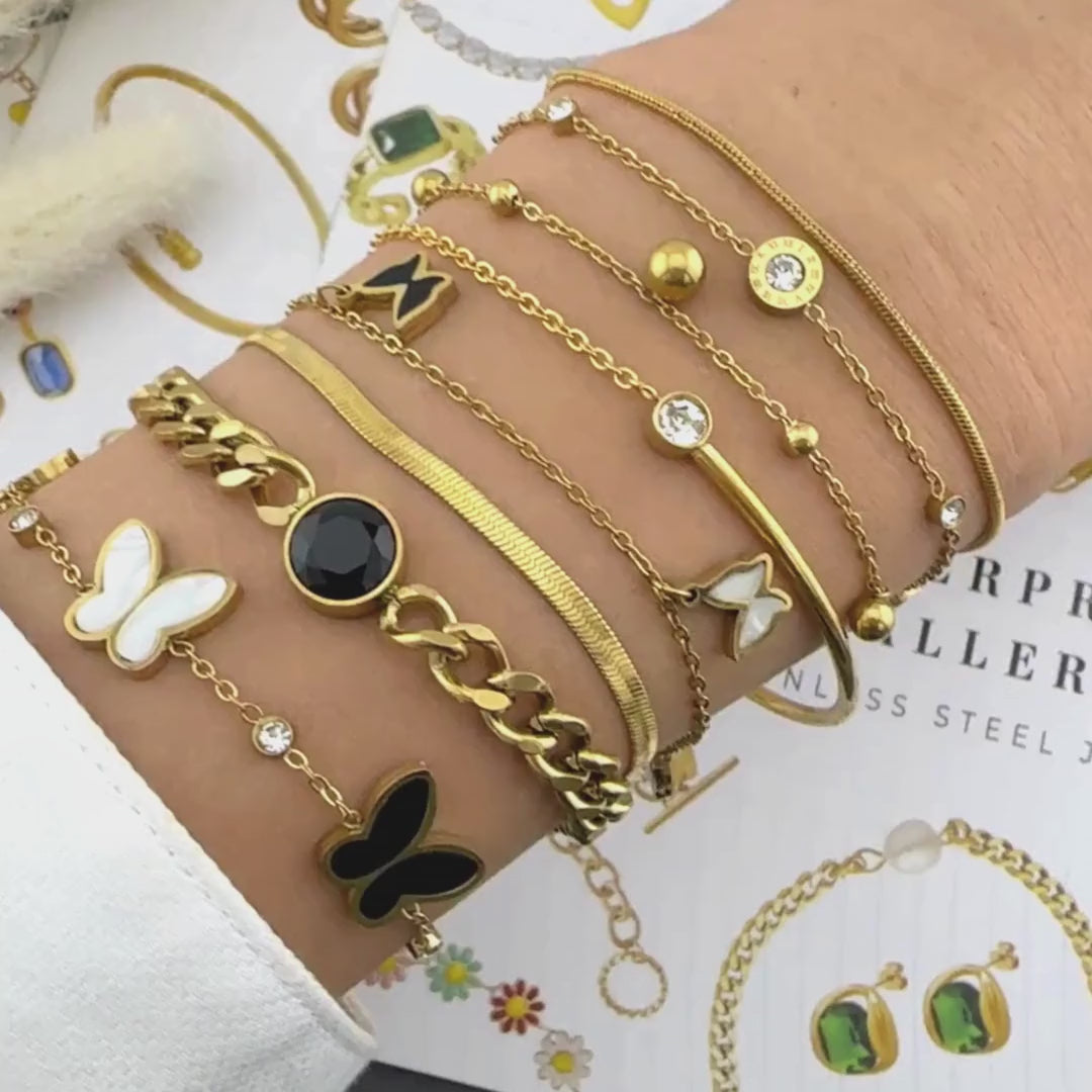 Erleben Sie die subtile Magie des Armbands „BUTTERFLIES“ , bei dem Stärke und Raffinesse in einem einzigartigen Design vereint sind. Dieses atemberaubende Armband ist sorgfältig aus hochwertigem Edelstahl gefertigt und mit einer luxuriösen 18-Karat-Vergoldung versehen. Das Ergebnis ist ein Schmuckstück, das nicht nur in schönem, langanhaltendem Glanz strahlt, sondern auch eine außergewöhnliche Haltbarkeit bietet.