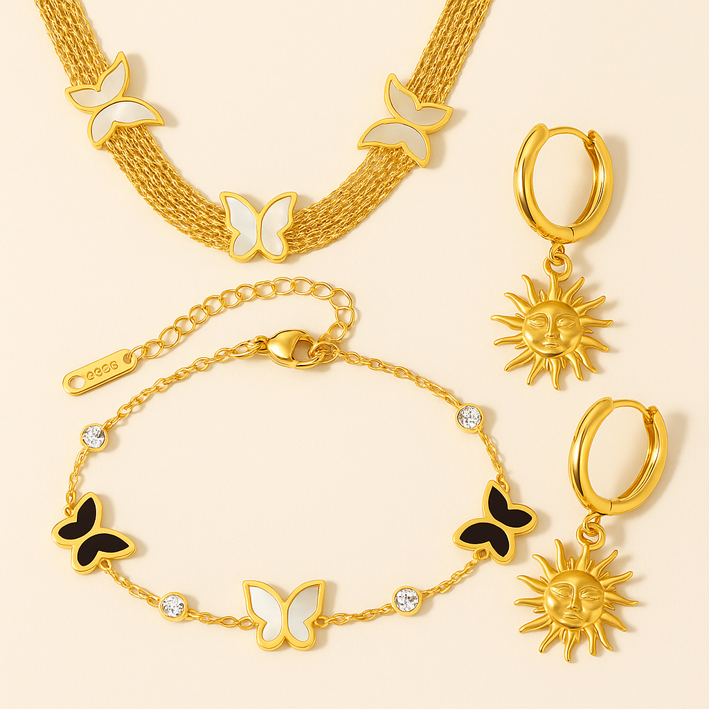 Butterfly & Sun Jewelry Set – Necklace, Bracelet & Earrings – Gold Plated