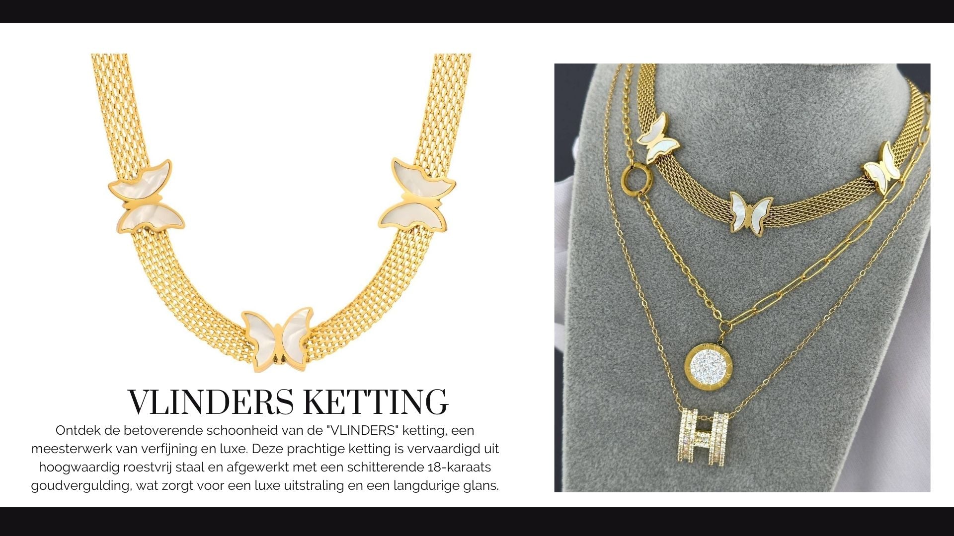 Ontdek de betoverende schoonheid van de "VLINDERS" ketting, een meesterwerk van verfijning en luxe. Deze prachtige ketting is vervaardigd uit hoogwaardig roestvrij staal en afgewerkt met een schitterende 18-karaats goudvergulding, wat zorgt voor een luxe uitstraling en een langdurige glans.