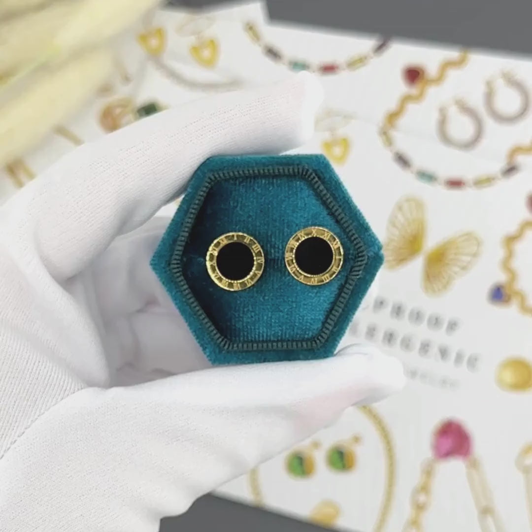 Earrings: Coordinating stud earrings with a black enamel center and Roman numeral engravings for a stylish finish.