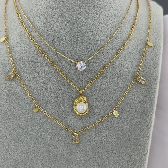 Necklace: A gold-plated chain with a unique pendant design, featuring a luminous pearl embraced by a sculpted golden frame.