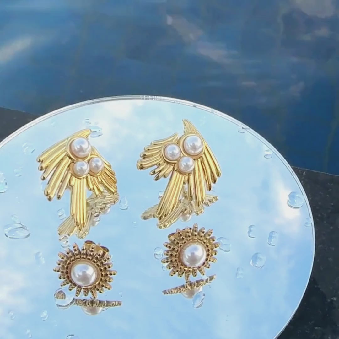 Earrings: Radiant pearl studs framed with gold sunburst details, combining sophistication and bold design.